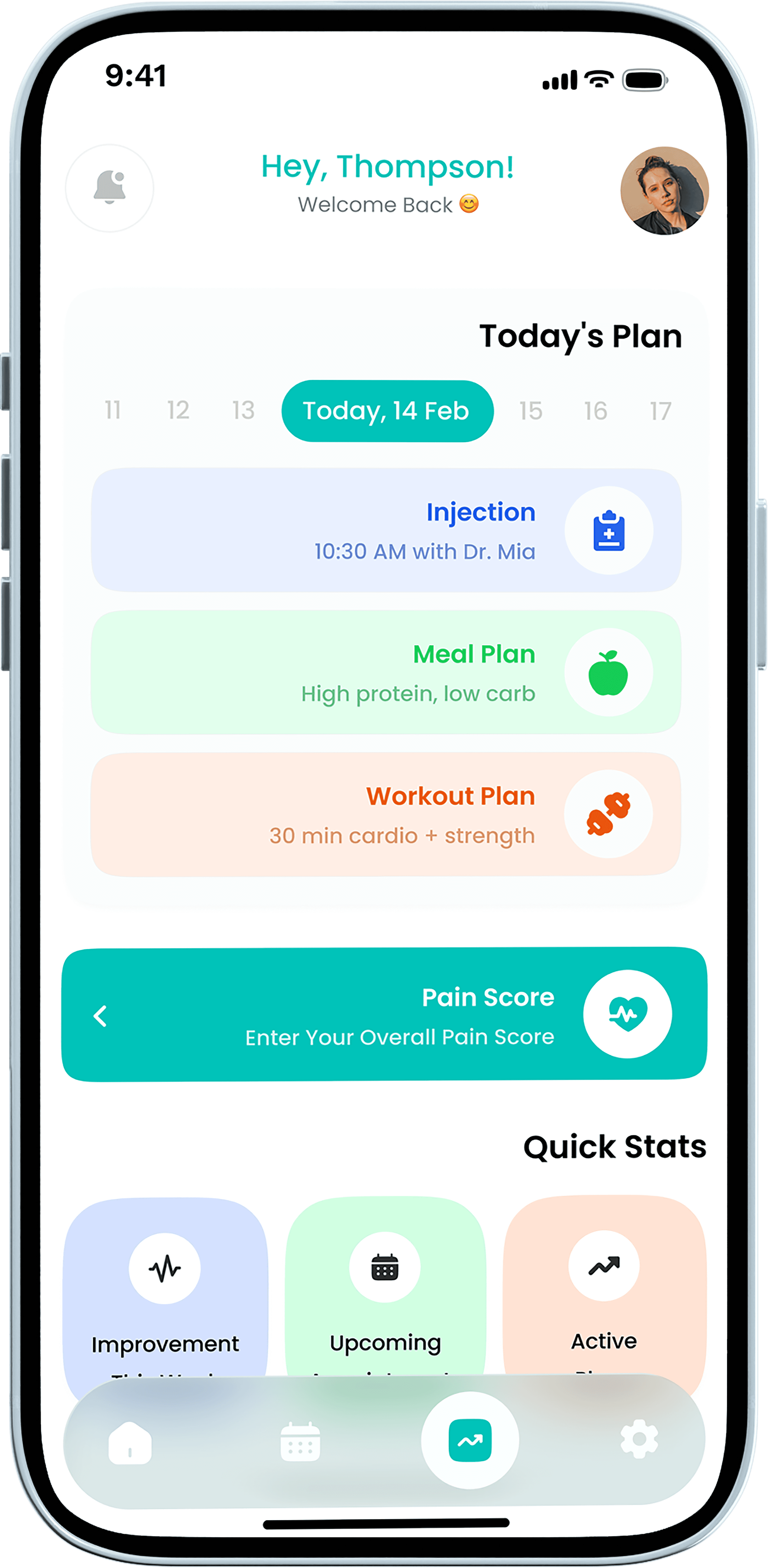 Your fully branded mobile app, ready for patients. On first login, patients complete a questionnaire and receive personalized programs instantly.