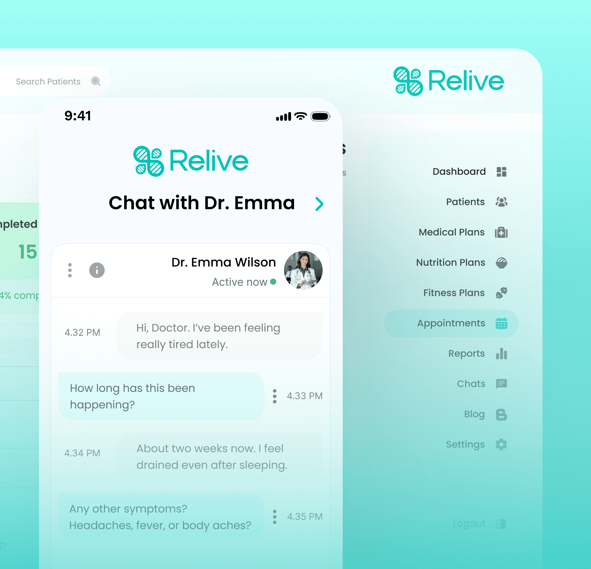 Manage medical plans, nutrition programs, workouts, and appointments from one unified dashboard. Communicate securely through built-in chat.